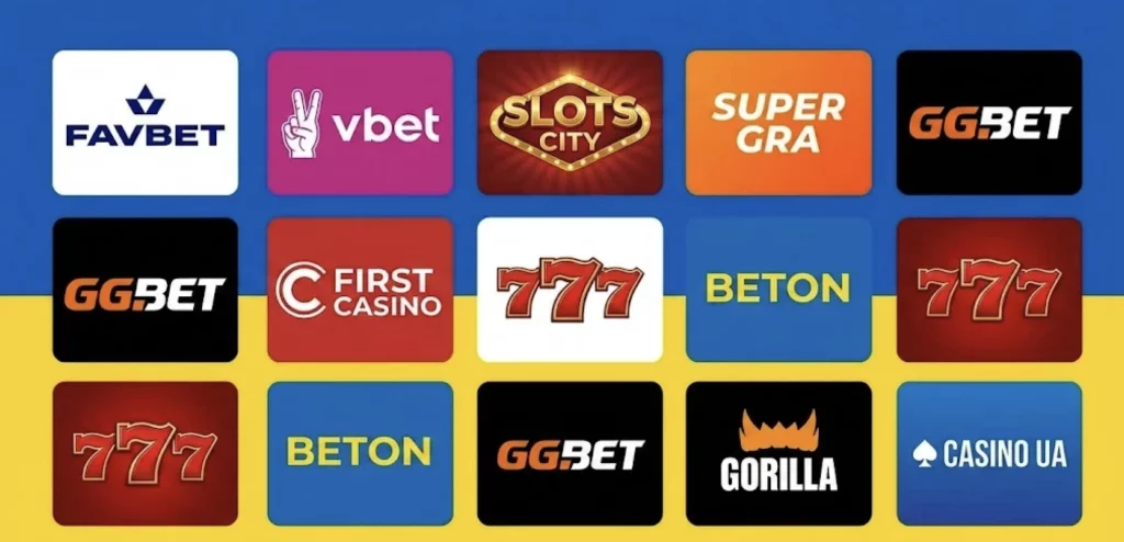 - За оцінкою профільних медіа, станом на весну 2025 року в Україні працюють близько 15 легальних онлайн-казино, які мають українські ліцензії. У переліку згадуються Slots City, 777, Casino UA, Vegas, Beton, Favbet, VBET, GGbet, Betking, Gorilla, ChampionClub, SuperGra, First, Prematch, Champion Casino.
